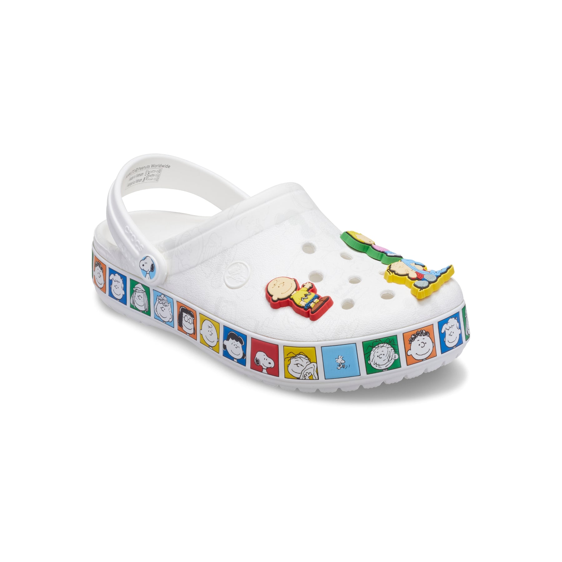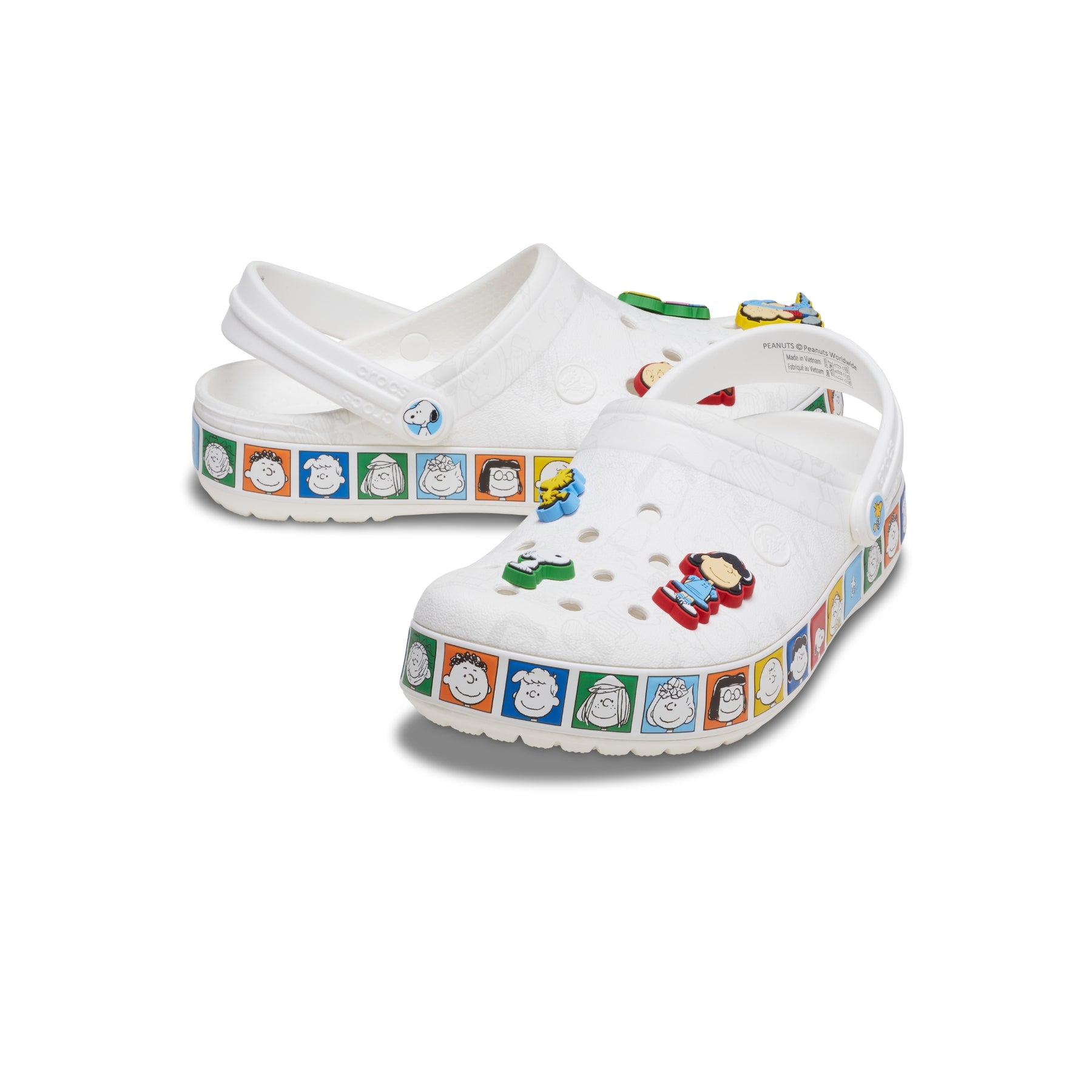 แก๊ง Peanuts™ มาครบแล้ว! รองเท้า Peanuts™ Crocband Clog มาพร้อมลวดลายตัวละครแบบเรียบๆ บนตัวรองเท้าด้านบน ตัดกับภาพตัวละครสีสันสดใสรอบพื้นรองเท้า เช่น Peppermint Patty, Marcie, Franklin และตัวละครอื่นๆ อีกมากมาย ตัวรองเท้ายังตกแต่งด้วย Jibbitz™ ที่มีตัวละคร Charlie Brown, Snoopy, Lucy, Linus, Sally และ Woodstock เพิ่มความโดดเด่นและความน่ารักในทุกมุมมอง รุ่นนี้เป็นรองเท้าสไตล์สบาย ๆ ใส่ง่ายในชีวิตประจำวัน เติมสีสันสดใสและกลิ่นอายความสนุกแบบคลาสสิกของ Peanuts™
