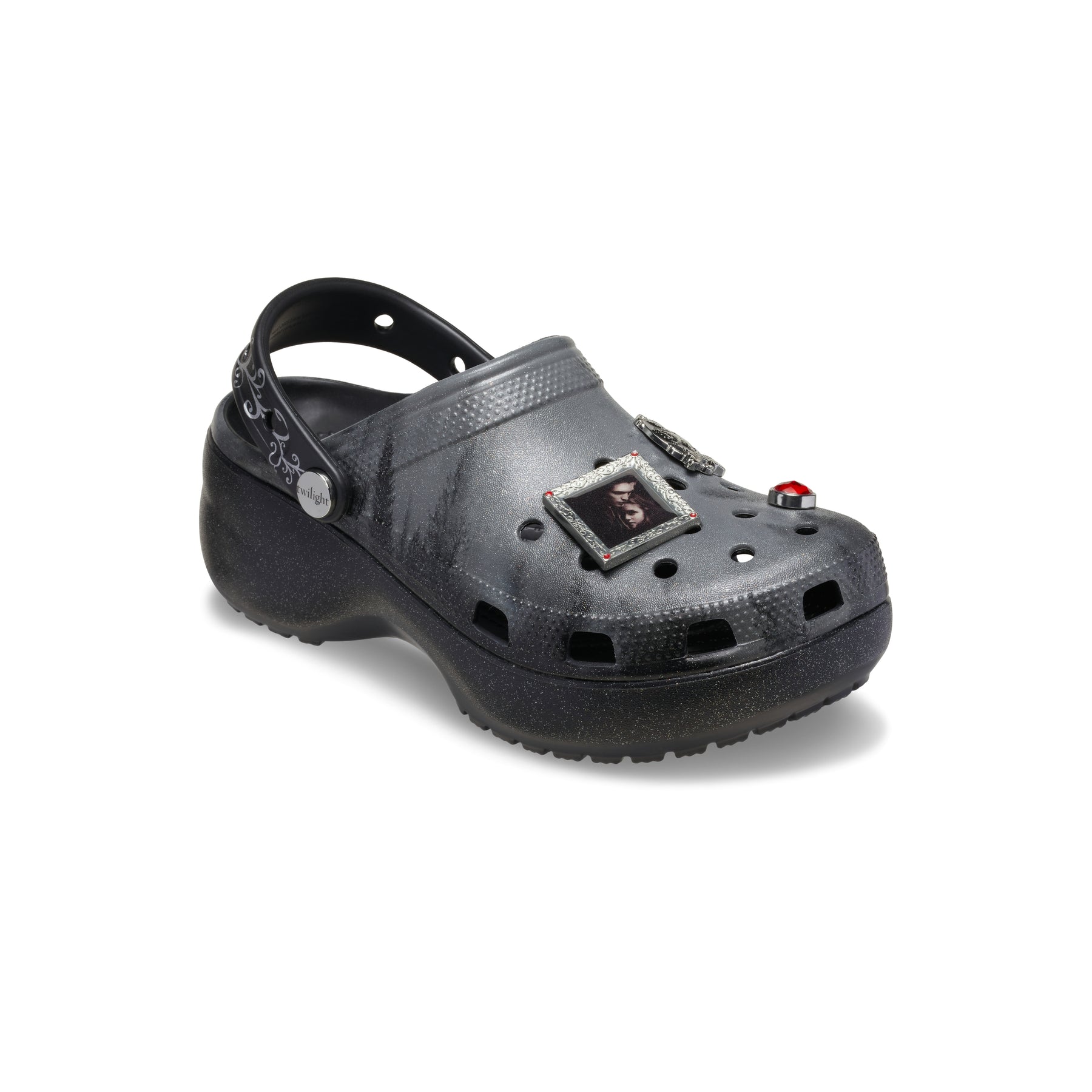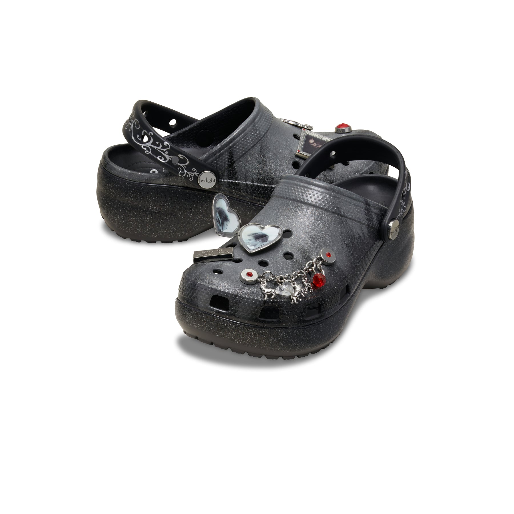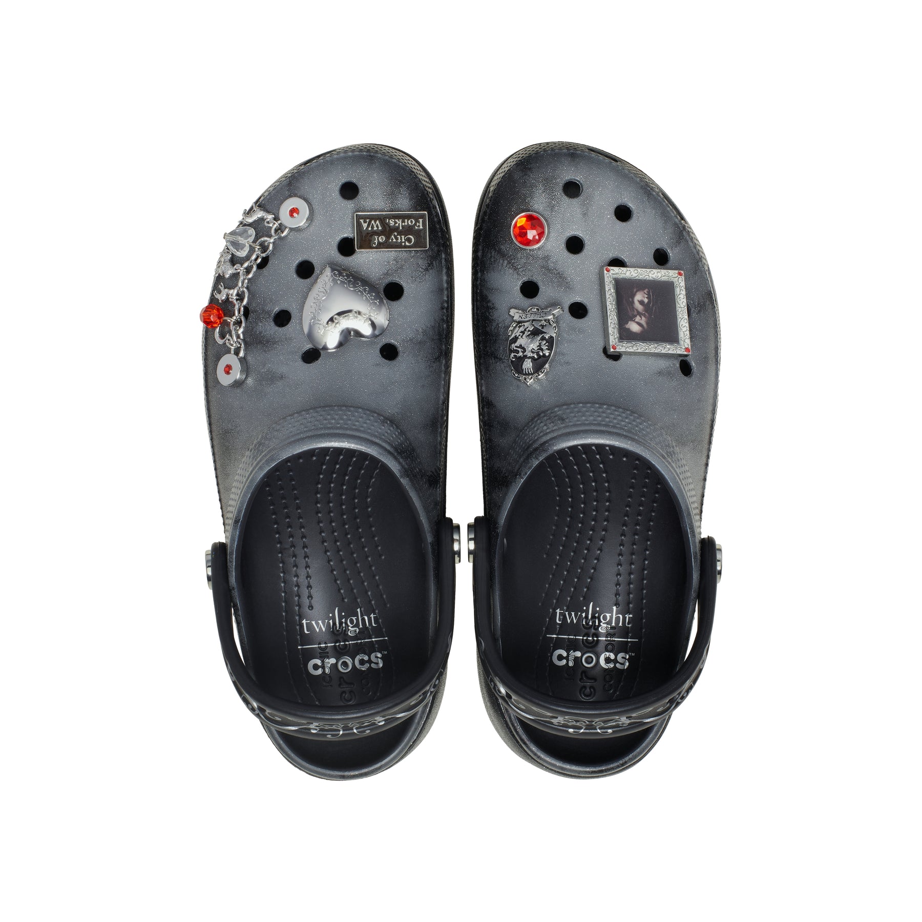 ตัวรองเท้าพิมพ์ลายป่ามืดแสนลึกลับในหมอกเบาๆ ให้ฟีลเหมือนอยู่ในโลกของทไวไลท์ พร้อมแต่งลูกเล่นประกายวาวนิดๆ ให้ดูมีมิติ สายรัดด้านหลังเพิ่มดีเทลลวดลายสุดเก๋ มาพร้อม Jibbitz™ จัดเต็ม ทั้งอัญมณีสีแดงเลือด ตราประจำตระกูลคัลเลน กรอบภาพของเอ็ดเวิร์ดและเบลล่า จี้ล็อกเก็ตรูปหัวใจ และป้ายเมือง Forks, WA ยังมีสายโซ่ประดับเม็ดคริสตัลเพิ่มความระยิบระยับ พร้อมจี้เล็กๆ รูปหมาป่า สิงโต และลูกแกะ ที่แฟนทไวไลท์เห็นแล้วต้องยิ้มออกแน่นอน
